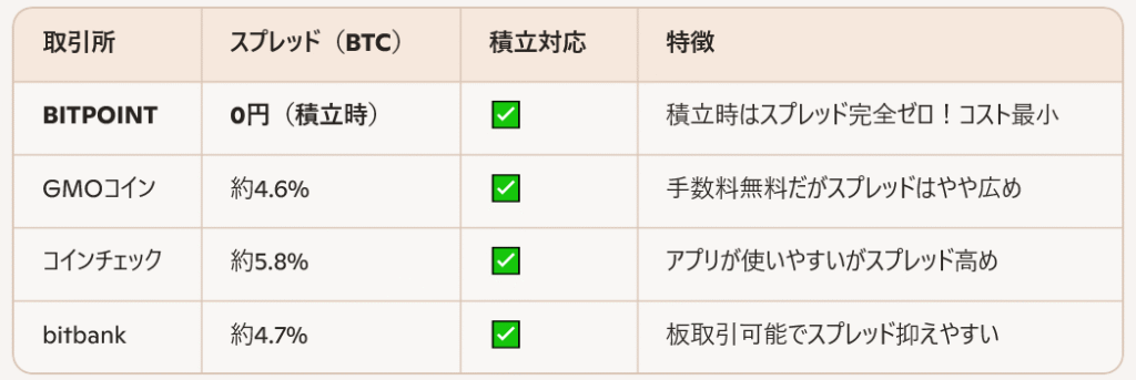 🔍 主要取引所との比較表(ビットコイン積立)